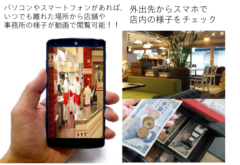 外出先から店舗や社内、工場の様子が見たい⇒監視カメラがあればスマホで確認出来ます。