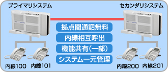 拠点システム(セカンダリシステム)をメインオフィスのシステム(プライマリシステム)で制御します。複数オフィスのUNIVERGE Aspire Xがひとつのシステムとして動作し、システムの一元管理や機能の共有など、より自由度の高いシステムが構築できます。