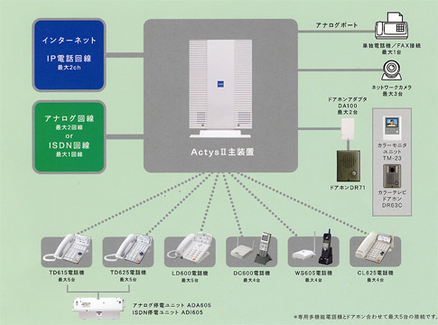 Actys II は多彩なビジネスホン機能はもちろん、光IP電話サービス「ひかり電話」やルータ機能をオールインワンでコンパクトに対応した、SOHOや小規模事業所向けビジネスホンです。IP電話回線最大2回線、INSネット64最大1回線、多機能電話機を最大5台収容可能です。